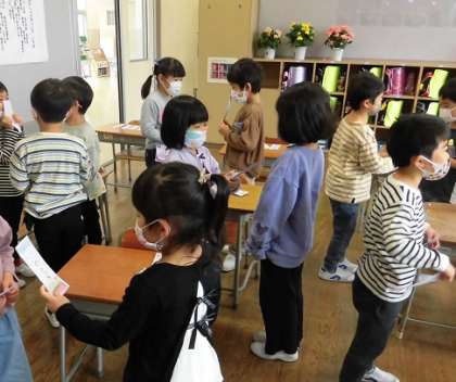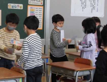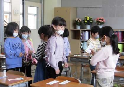 クラスの友達と名刺交換をしました。自分の名前や好きなものを相手に伝えて、「仲良くしようね」「いっしょに遊ぼうね」と付け加えました。「にこにこなかよしの輪」が広がっていきます。