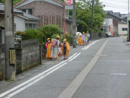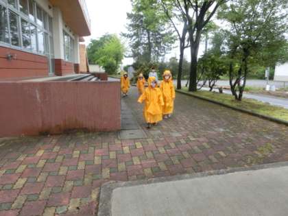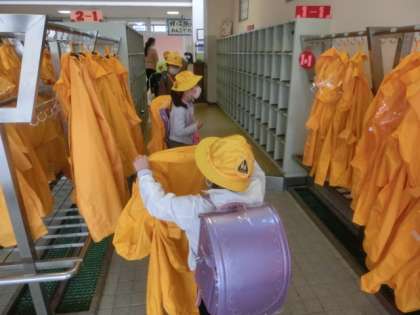 小雨の中、子供たちが登校してきました。1・2年生は、カッパを着ています。上級生が1年生の荷物を持ったり、玄関でカッパをかけたりする優しい姿が見られました。