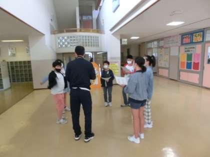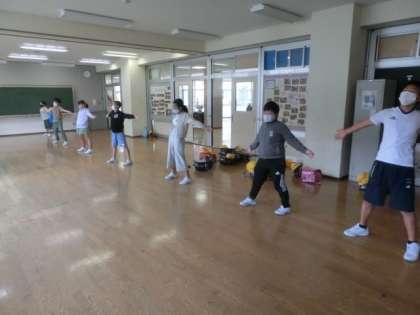 朝、5・6年生が、明日の運動会に向けて、ラジオ体操の練習や係の打合せなどをしています。自分の仕事に責任をもって取り組む様子が分かります。