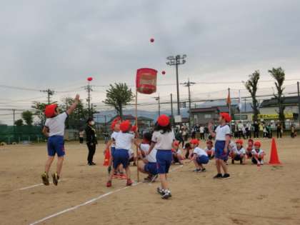 1〜3年生が、玉入れをがんばりました。結果は、青団が合計33個も入れて優勝しました。