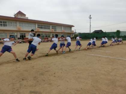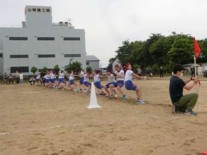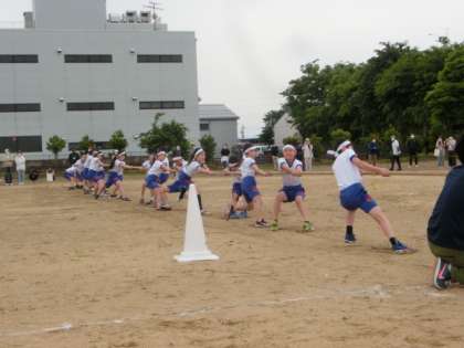 4年生以上の「綱引き」です。赤団が2回とも力強く勝って、1位でした。腰を落としているのがよく分かります。