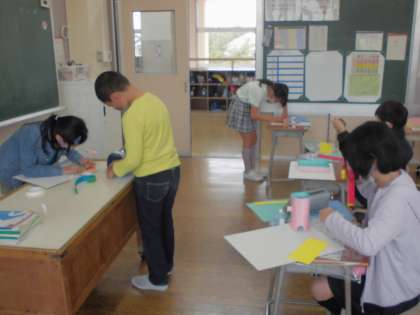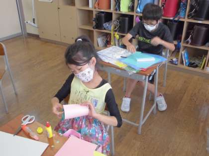 図工では「コロコロガーレ」の学習が始まりました。立体的なコースをイメージして、楽しく工作しました。