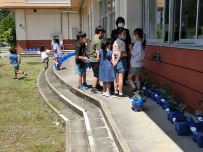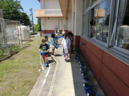 5月18日(水) 2年生 ミニトマトのおひっこし 公開日 2022/05/18 更新日 2022/05/18 学校の様子 2年生が、グラウンドの畑のそばで植えたミニトマトの鉢(はち)を、教室外のベランダに運びました。これで、朝、すぐに水やりをしたり、風が強ければ中に入れたり、様子を見たりすることができます。さっそく、くきや花などの様子を見て、絵や文で書いていました。