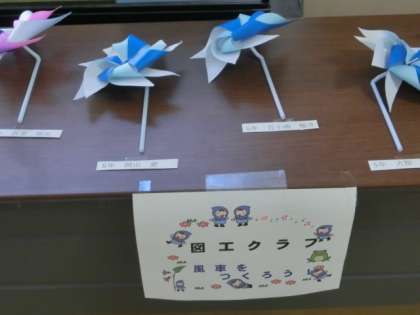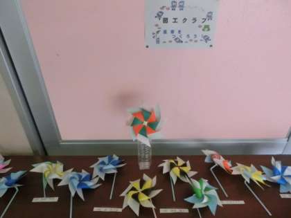 昨日(17日)の図工クラブで作った風車(かざぐるま)。今日から暑い日が続くので、なおさら涼しげに感じられます。