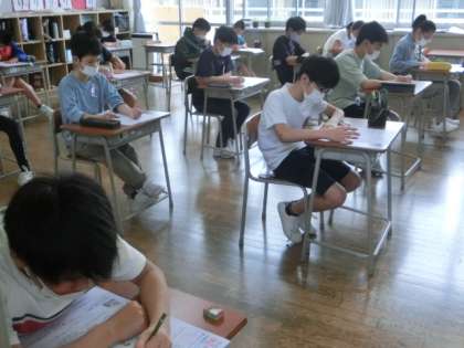 6年生が、1時間目から、算数のテストにのぞんでいます。最高学年らしく、どの子も真剣に取り組んでいました。
