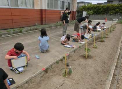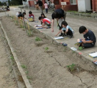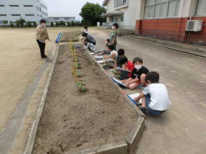 2年生が育てている野菜のなえをよく観察して、気付いたことを絵や文で記録しています。毎朝、水やりをしていますが、書くとなると、見方がちがってくるようです。