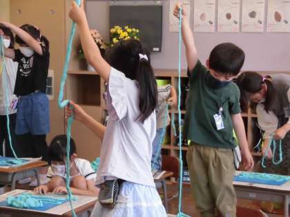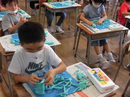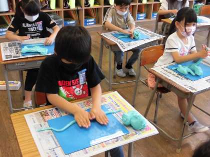 1年生 長く長く、ねんどをのばしたよ 公開日 2022/05/25 更新日 2022/05/25 学校の様子 図画工作科「ひもひもねんど」の学習をしました。できるだけ長く、ひも状でのばした後、そのひも状のねんどを使って何ができるか考えました。ペロペロキャンディやかたつむり、塔、おひさまなど、子供たちはいろいろなものを作り上げていました。