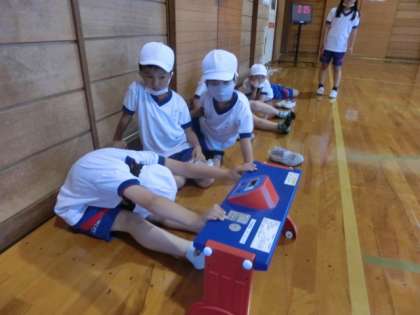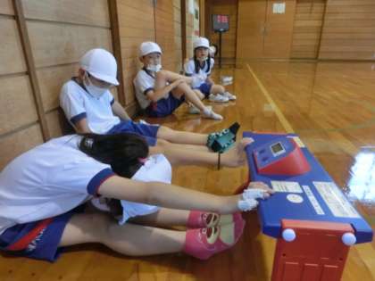 2年生が、体育のスポーツテストで、長座体前屈の記録を測りました。家庭でもストレッチなどで練習しており、柔軟性が伸びた子供もいました。