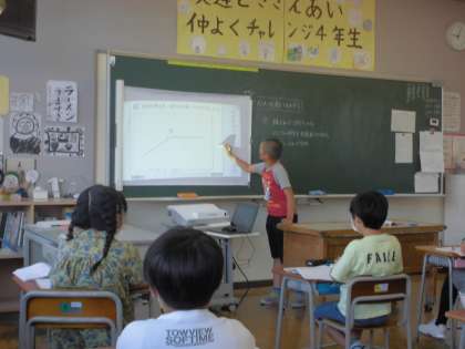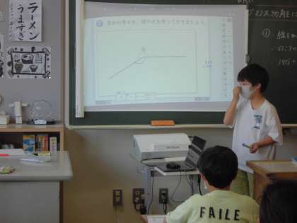 算数では180度より大きな角の測り方を考えました。補助線を引いて180度を基準にしたり、360度からもう一方の角を引いたりする方法を考え、発表しました。