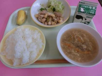 「ごはん、あっさりチキン、そえ野菜、卵ともずくのスープ、バナナ」。「もずく」についての豆知識を紹介する放送委員でした。