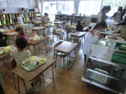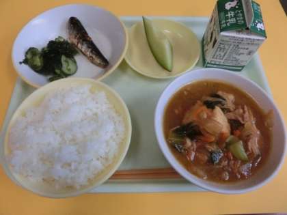 今日の給食メニューは、「ごはん、いわしのとさ煮、酢の物、厚揚げの味噌いため、メロン」でした。