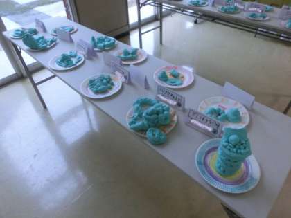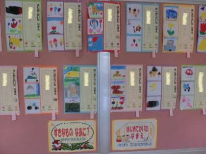 1年生の廊下には、「初めての名前」や粘土作品が展示されています。