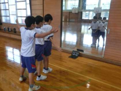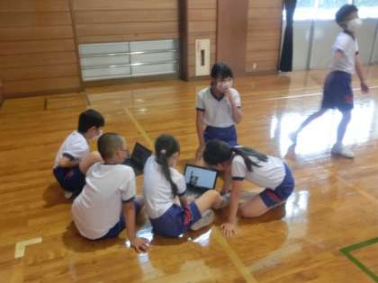 5年生が、3人チームで仲良く協力・相談しながら、リズムダンスを練習しています。