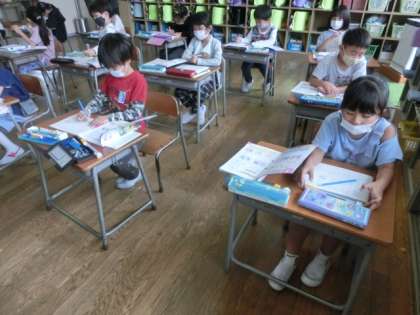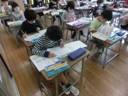 1年生算数。ブロックを「ガッチャン」しながら、3+2の計算の仕方を考えて、ノートに式と答えをしっかり書いています。