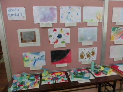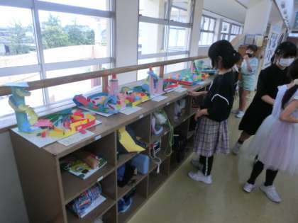 4年生の廊下には、図工「コロコロガーレ」や「絵の具でゆめもよう」の作品、理科の観察日記などが展示してあります。明日の学習参観にお越しの際にご覧ください。