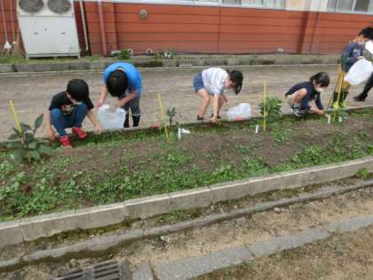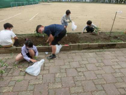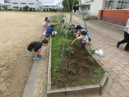 2年生が、野菜を育てている畑のそうじをしました。野菜とともに、草もたくさん生えてきたので、みんなで除草しました。毎日の世話のおかげで、きゅうりやピーマンなどの実がなってきました。