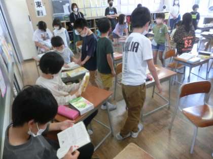 3年生国語「言葉であそぼう」の授業です。「いかがかい」など、ふしぎな言葉やおもいしろい文書を、友達と相談したり辞書や教科書で調べたりしながら、発表し伝え合っています。