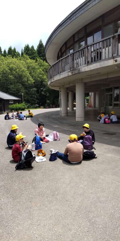 天気もよく、富山平野を眺めながら、仲良く弁当を食べる5年生。