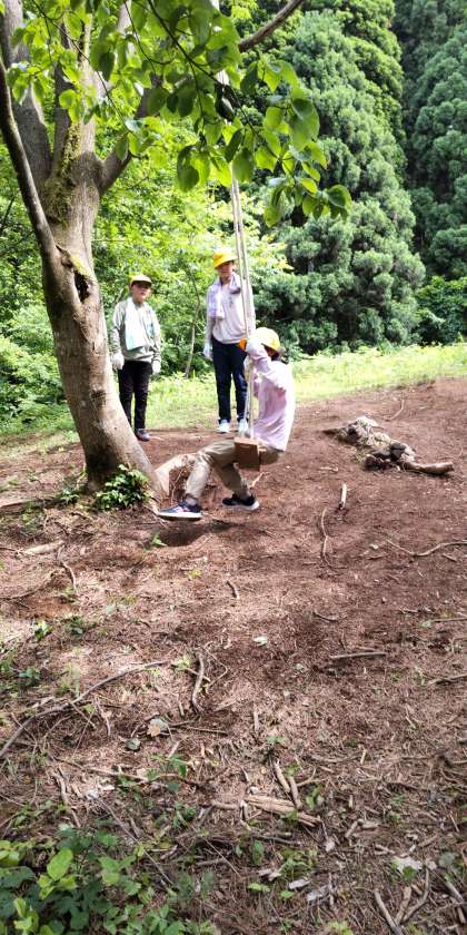 森で、木にロープを縛り、ターザンブランコや綱渡りで遊びました。