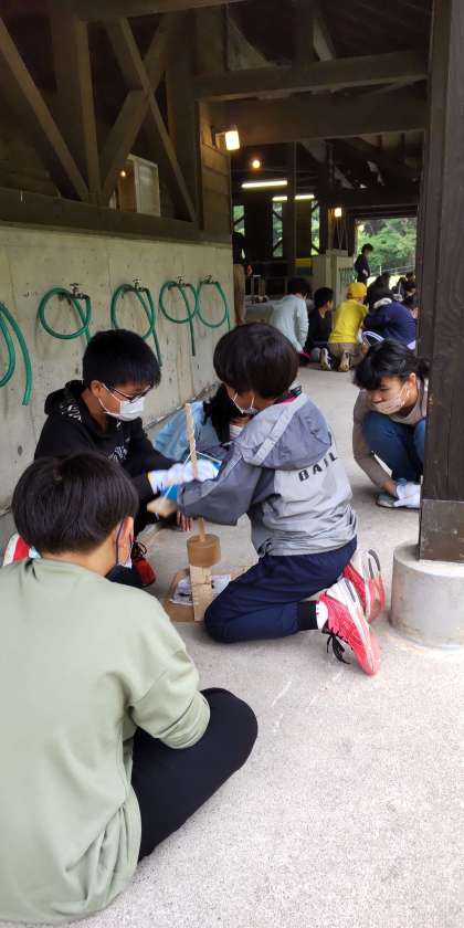 火起こし道具を使って、力を合せて頑張っています。ただ今、二班、火がつきました