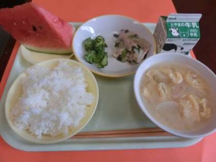 今日の給食は「ごはん、豚肉の塩こうじ炒め、きゅうりもみ、味噌汁、すいか」でした。1年生も、今年初めての大きなスイカにびっくり!