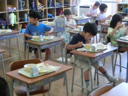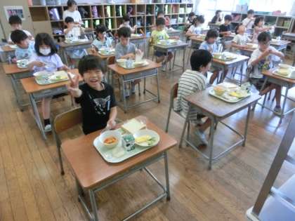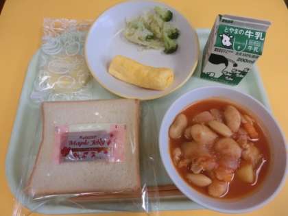 「食パン、卵ロール、フレンチサラダ、豆と鶏肉のトマト煮、メープルジャム、冷凍パイン、牛乳」。今日も暑いので、子供たちは、冷凍パインや冷たい牛乳をなおさらおいしそうに食べて飲んでいました。