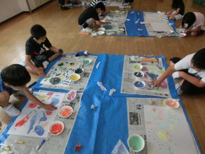 2年生が、図画工作で、とろとろの絵の具を手に着けて、画用紙いっぱい思い思いに絵を描いています。「手が気持ちいい」「花火や海、魚をかこう」中には、何か分からないけれど不思議なデザインも見られます。