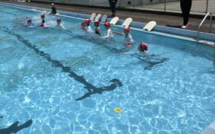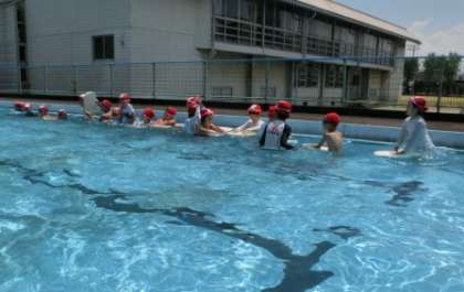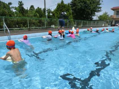 7月8日(金) 楽しく水に慣れる1・2年生 公開日 2022/07/08 更新日 2022/07/08 学校の様子 1・2年生が、3回目の水遊びです。今日は、ビート板を使って歩いたり、顔を水につけたり、「水中宝さがし」をしたりしました。だいぶ水に慣れてきて、2年生は、けのびやバタ足ができる子も増えてきました。 ★ミニ動画クリック→2年けのび・バタ足