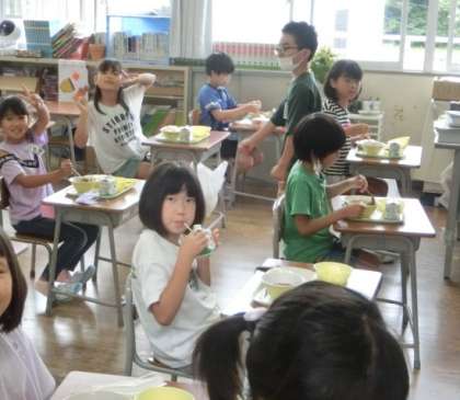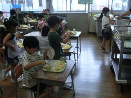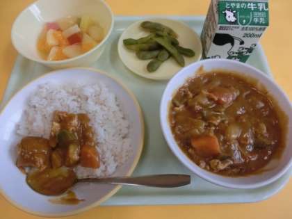 今日の献立は、「麦ごはん、トマト・かぼちゃ・なすび・ズッキーニ・ピーマンなどが入った夏野菜カレー、枝豆、フルーツカクテル」でした。1学期、おいしく安全に給食を食べることができました。