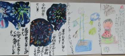何人かの子供たちから、学校の先生に、暑中見舞いのハガキが届いています。アサガオや花火、すいかなどの絵や文章から、夏休みを楽しんでいる様子が感じられます。元気そうなハガキを送ってくれて、ありがとう。