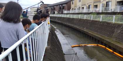 4年生が、海洋ごみの特別授業を受けています。まずは、市内の川で、オイルフェンスやごみの様子を見学しました。