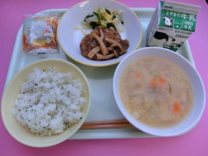 今日の献立は「なめしごはん、ハンバーグのきのこソースがけ、コーンあえ、さつま汁、月見大福」でした。