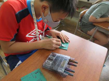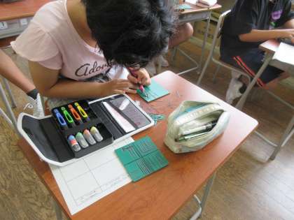5年生は、ゴム板を使った版画の学習を始めました。彫りたい線や、模様によって彫刻刀を使い分けながら、丁寧に掘り進めています。