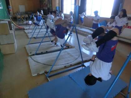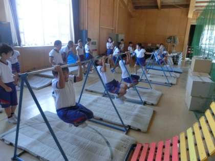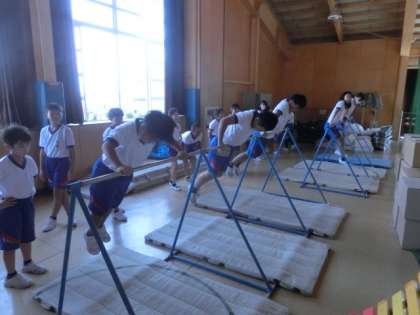 9月12日(月) 4年生 鉄棒運動 公開日 2022/09/12 更新日 2022/09/12 学校の様子 4年生が、体育館2階の室内鉄棒で練習をしました。 ぶら下がり競争、こうもり練習(←クリックしてミニ動画。1学期にメールで連絡したパスワード入力)、つばめ、前回りおり、逆上がりなどに挑戦しました。