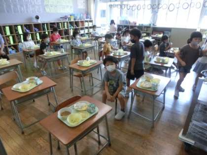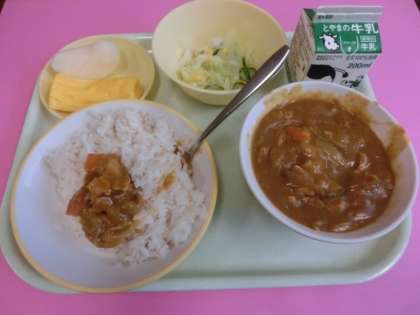 今日の献立は、「麦ごはん、カレー、卵ロール、コールスローサラダ、なし(果物)」でした。