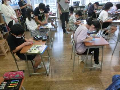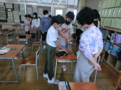 5年生が図工で、ゴム板を彫刻刀でほって、いろいろな模様を作っています。直線、曲線、大きさ、深さなどに合った彫刻刀を使い分け、友達と互いに作品を見合っています。