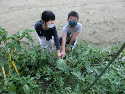 2年生の畑では、丸々としたスイカが、まだいくつか育っています。2年生が心をこめて汗を流して育てた野菜は、秋になっても実っています。「今までも食べたけれど、まだおいしいかな」