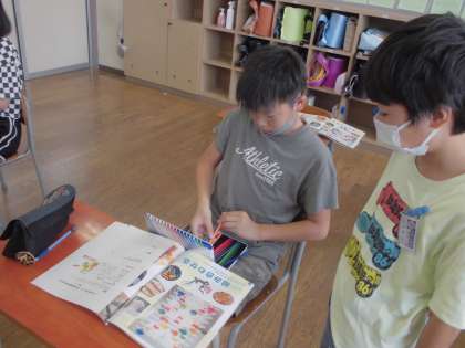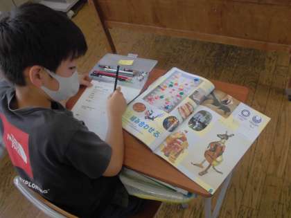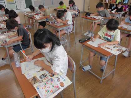 図画工作科では「ひらめきポケット」の学習をしました。作品を鑑賞して、その中に隠れている形や色を見付けました。身の周りの物も、いろいろな形や色の組合せでできていることに気付きました。