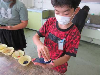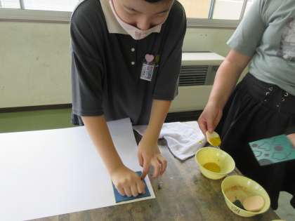 9月27日(火)5年生「ほってほっていろんな模様」3 公開日 2022/09/27 更新日 2022/09/27 学校の様子 オリジナルの模様をデザインし、丁寧に彫り進めたゴム板を刷ってみました。色を変えたり、ゴム板を重ねたりしながら工夫して刷りました。