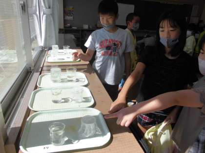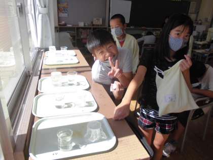 理科では「自然の中の水のすがた」の学習をしています。水は空気中に出ていくのかを調べる実験をしました。一日を通して変化の様子を観察しました。