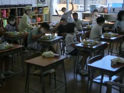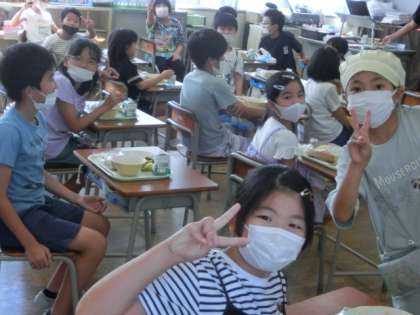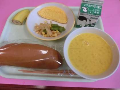9月最後の給食は「黄色い給食」 公開日 2022/09/30 更新日 2022/09/30 学校の様子 「黒糖コッペパン、オムレツ、コーンアスパラサラダ、かぼちゃスープ、バナナ」でした。黄色い給食エプロンを着ている3年生の子供たちからは「今日は黄色の給食だね」という声が聞かれました。明日から10月です。
