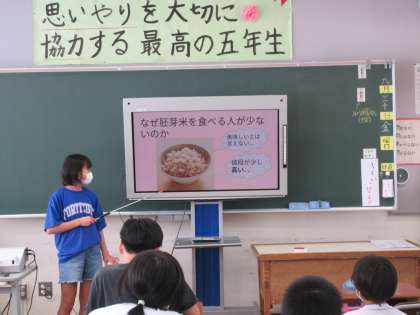 9月30日(金) 5年生 プレゼンテーションをしよう(総合的な学習の時間) 公開日 2022/09/30 更新日 2022/09/30 学校の様子 日本の主食である「米」について調べたことをクロムブックを使ってまとめ、クラスの友達にプレゼンテーションしました。「世界で米を多く食べている国はどこか」「米はなぜ白いのか」など、様々なテーマについての発表が見られました。