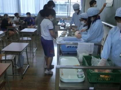 「ごはん、ちぐさ(卵)焼き、かぼちゃのいとこ煮、白菜なべ、みかん」でした。画像は、自分たちで準備・配膳をする5・6年生です。