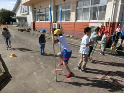10月25日(火) 竹馬コーナー 公開日 2022/10/25 更新日 2022/10/25 学校の様子 グラウンド横のスペースに「竹馬コーナー」をつくりました。まずは低い竹馬で練習し、友達同士で支えたり教え合ったりする姿が見られました。休み時間等で自由に遊びます。
