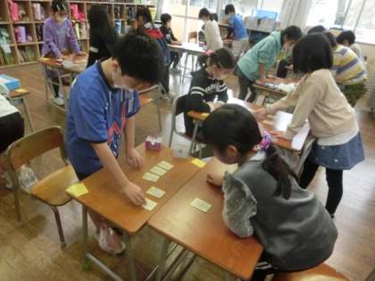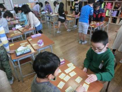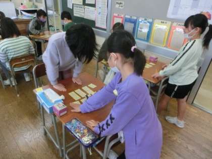 11月1日(火) 3年生 百人一首 公開日 2022/11/01 更新日 2022/11/01 学校の様子 3年生が、仲良く2人組で百人一首に取り組んでいます。下の句を覚えていて、「ひさかたの〜」と読みが始まると、すぐに札を取る子供もいます。