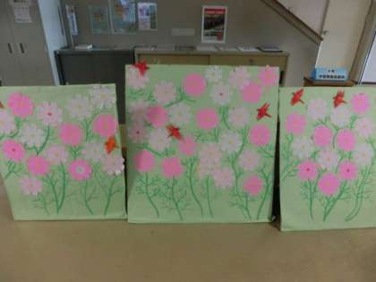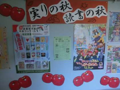 校内では、毎日、変化のある掲示や作品展示が見られ、まわるのが楽しみです。読書を勧める図書室前の掲示、6年生が学習発表会で作成した背景など、秋らしい環境が整備されています。