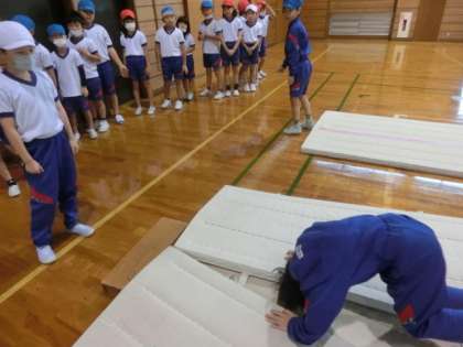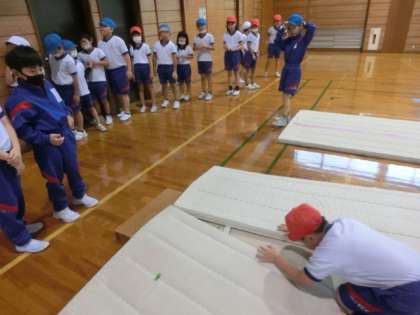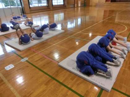 2年生が、体育でマット遊びをしました。きれいな前回りや後ろ回りができるように、ゆりかごを練習したり、マットや踏み切り板を重ねて用具を工夫したりしました。