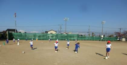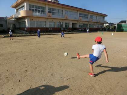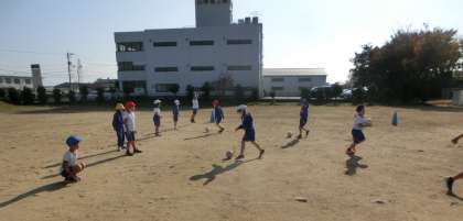 2年生が、秋晴れのグラウンドで、サッカー遊びをしました。ボールタッチ、ドリブルゲーム、パスゲームなど、秋晴れのグラウンドで、思い切りボールをけって楽しみました。
