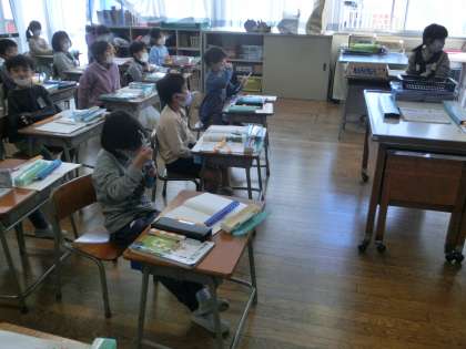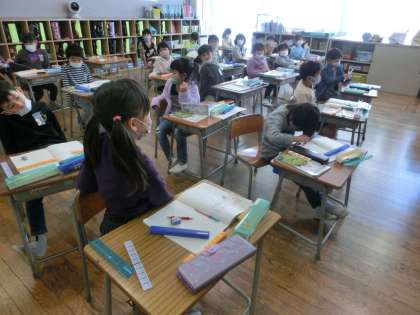 1年生が算数では、ブロックを使いながら「13ー9」の計算の仕方を考えています。実際に物を使う操作活動から、さくらんぼ方式や立式による考え方を話し合っています。