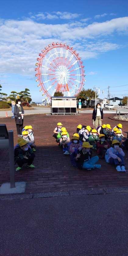 大きな観覧車をバックに、これから水族館見学です。